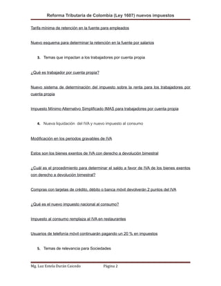 La reforma tributaria de Colombia de 2012 introdujo nuevos impuestos y modificaciones a los existentes. Entre los cambios más relevantes se encuentran: 1) la creación del Impuesto Mínimo Alternativo para personas naturales y del impuesto a la equidad CREE para sociedades; 2) la reducción de la tarifa de renta para sociedades del 33% al 25% y 3) cambios en el IVA con tres nuevas tarifas y la creación de un impuesto nacional al consumo. La reforma buscó mejorar la distribución de la carga tributaria favoreciendo a