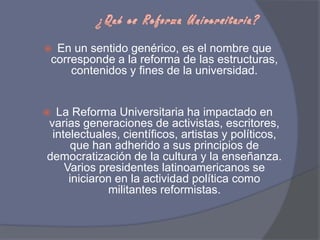 La reforma universitaria, iniciada en 1918 en Córdoba, Argentina, busca democratizar la educación y garantizar la autonomía de las universidades ante el autoritarismo político. Influenció a múltiples activistas y líderes políticos en América Latina, convirtiéndose en un movimiento esencial para la cultura y la enseñanza en la región. A lo largo de la historia, esta reforma sigue siendo relevante, enfatizando la importancia de la educación autónoma para el desarrollo social.