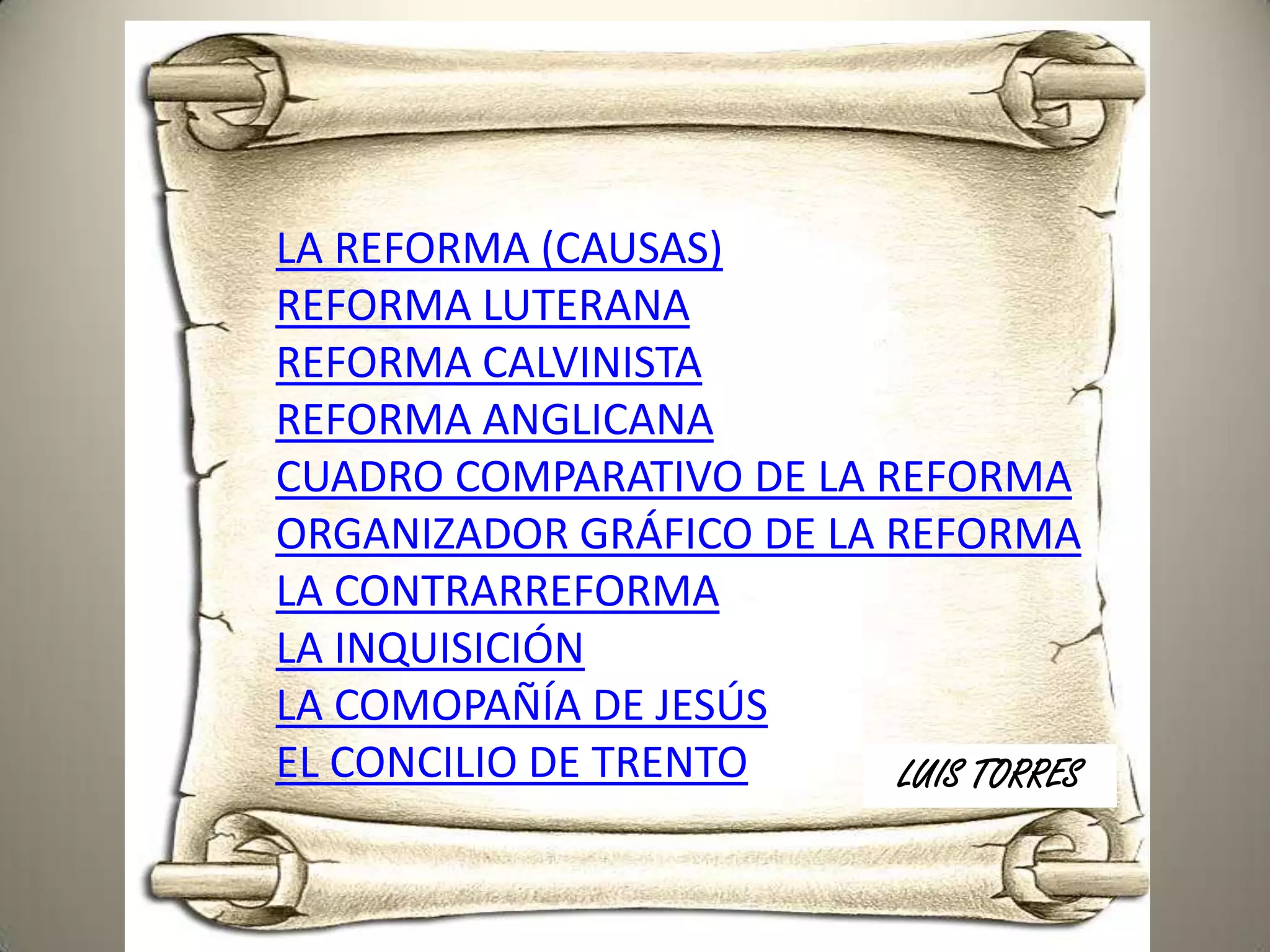 Este documento describe los principales eventos y figuras de la Reforma Protestante y la Contrarreforma Católica en el siglo XVI. La Reforma incluyó las corrientes luterana, calvinista y anglicana, iniciadas por Lutero, Calvino y Enrique VIII respectivamente. La Contrarreforma buscó contrarrestar la Reforma a través de la reimplantación de la Inquisición, la fundación de la Compañía de Jesús, y la convocatoria del Concilio de Trento.