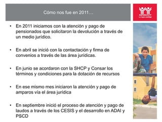 El documento describe el proceso de devolución de los recursos de la subcuenta de vivienda a los pensionados por la Ley del Seguro Social de 1973 a partir de enero de 2012. Explica que los beneficiados se dividen en 4 grupos: 1) nuevos pensionados a partir de enero de 2012, 2) personas actualmente pensionadas, 3) pensionados con demanda en trámite y 4) pensionados sin demanda o con demanda en contra. También presenta un modelo de atención para cada grupo distinguiendo sus peculiaridades.