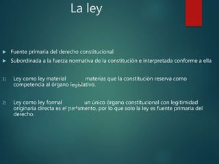 El documento resume el proceso de formación de leyes y reformas constitucionales en Chile. Explica que existen tres tipos de leyes (orgánicas constitucionales, de quórum calificado, y ordinarias) y cómo se promulgan decretos con fuerza de ley. También describe el procedimiento detallado para reformar la constitución, incluyendo iniciativa, discusión, aprobación, ratificación, sanción, promulgación y publicación. Resume las principales reformas constitucionales entre 1980-2017.