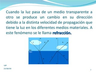 La refracción ocurre cuando la luz pasa de un medio a otro con diferente índice de refracción, cambiando su dirección. La relación entre los ángulos de incidencia y refracción se expresa a través de la ley de Snell. El índice de refracción de un material depende de la velocidad de la luz en él.