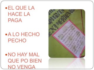 Este documento presenta varios refranes populares españoles agrupados en cuatro categorías: amor, verdad, sueños y consecuencias de acciones. También describe la experiencia de aprendizaje del autor al buscar y analizar los refranes, concluyendo que aunque algunos parecían contradecirse, trabajando en equipo lograron entenderlos mejor.