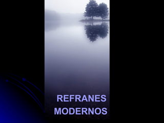 Este documento contiene una serie de refranes y frases modernas actualizadas de forma humorística. Algunos refranes se burlan de temas como el amor, el trabajo en equipo, la prevención y la política. Otros contienen juegos de palabras o dobles sentidos. En general, el documento utiliza el humor para actualizar dichos populares y proverbios conocidos.