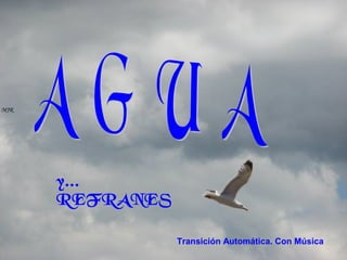 Este documento contiene una colección de refranes populares relacionados con el agua y el clima. La mayoría de los refranes ofrecen consejos prácticos sobre cómo predecir el clima o tiempo basado en observaciones de nubes, lluvia, sol u otros fenómenos meteorológicos. Los refranes también enfatizan la importancia vital del agua y aconsejan no desperdiciarla. El documento presenta estas expresiones sabias de forma breve, una por cada región o lugar mencionado de España y Francia.