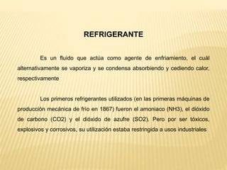 Este documento describe los diferentes tipos de refrigerantes utilizados históricamente y actualmente, incluyendo amoníaco, dióxido de carbono, freones y sus variantes como CFC, HCFC y HFC. Explica que los CFC dañan la capa de ozono y fueron reemplazados por HFC que contribuyen al efecto invernadero. También cubre las características deseables de los refrigerantes como seguridad, bajo impacto ambiental y propiedades termodinámicas.