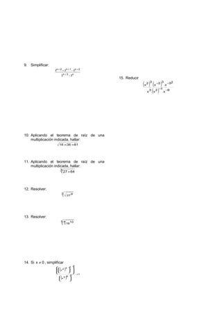 Este documento contiene una serie de ejercicios matemáticos sobre álgebra, incluyendo simplificar expresiones, resolver ecuaciones, aplicar teoremas de raíces y reducir fracciones.