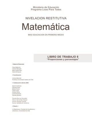 Este documento presenta varios problemas y guías relacionados con proporciones y porcentajes en matemáticas. Incluye ejemplos resueltos de cálculos con porcentajes, así como problemas para que el estudiante resuelva. Las guías cubren temas como el cálculo de porcentajes, determinar números dados porcentajes, y representaciones gráficas de porcentajes.