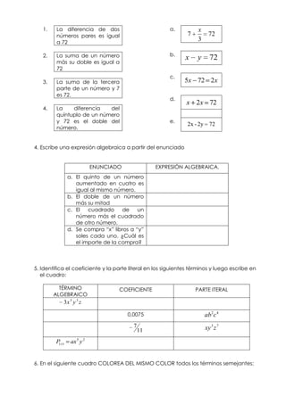 El documento contiene varios ejercicios de álgebra sobre expresiones algebraicas, ecuaciones de primer y segundo grado, y sistemas de ecuaciones. Los ejercicios incluyen identificar coeficientes y términos literales, clasificar expresiones, resolver ecuaciones cuadráticas y sistemas de ecuaciones lineales, y determinar distancias y pendientes en geometría analítica.