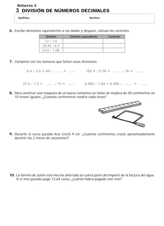 Este documento contiene ejercicios sobre divisiones de números decimales. Los estudiantes deben realizar varias divisiones con números decimales, comprobar los resultados, escribir divisiones equivalentes, y resolver problemas que implican dividir cantidades en partes iguales.