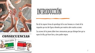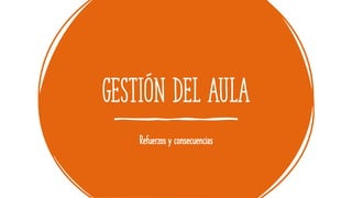 Este documento describe estrategias de refuerzo y consecuencias para gestionar un aula. Explica que los refuerzos positivos como el reconocimiento y pequeñas recompensas pueden motivar a los estudiantes. También detalla consecuencias negativas como quitar privilegios o hablar con los administradores cuando los estudiantes no siguen las reglas. El objetivo es enseñar a los estudiantes qué comportamientos son aceptables a través de las respuestas de los maestros.