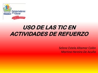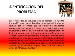 Este documento describe un proyecto para implementar el uso de las TIC en actividades de refuerzo de matemáticas. El proyecto busca desarrollar el pensamiento matemático de los estudiantes mediante el uso de software educativo. Se espera que los estudiantes mejoren su rendimiento académico y que los docentes se apropien de recursos digitales. El proyecto consiste en tres actividades principales utilizando computadoras portátiles y software de matemáticas.