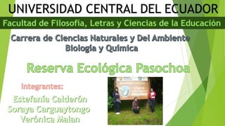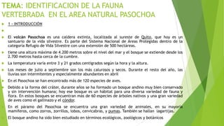 El documento describe la fauna vertebrada encontrada en el Refugio de Vida Silvestre Pasochoa en Ecuador. El Pasochoa es un volcán extinto de 4,200 metros que alberga un bosque andino bien conservado con más de 60 especies de árboles y una gran diversidad de aves y mamíferos. El objetivo del estudio fue determinar y registrar las especies de mamíferos, aves, reptiles y anfibios observadas en el refugio, incluyendo el cóndor andino, lobo de páramo y diversas aves como