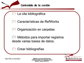 Este documento proporciona una introducción al uso del software de gestión bibliográfica RefWorks. Explica que RefWorks permite crear una base de datos personal de referencias bibliográficas de diversas fuentes y genera automáticamente bibliografías y citas en diferentes estilos. Además, muestra cómo importar registros desde bases de datos y páginas web, organizar y editar referencias, y citar fuentes en documentos de Word generando la bibliografía correspondiente.
