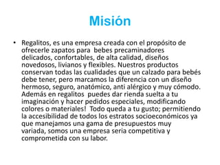MisiónRegalitos, es una empresa creada con el propósito de ofrecerle zapatos para  bebes precaminadores  delicados, confortables, de alta calidad, diseños novedosos, livianos y flexibles. Nuestros productos conservan todas las cualidades que un calzado para bebés debe tener, pero marcamos la diferencia con un diseño hermoso, seguro, anatómico, anti alérgico y muy cómodo. Además en regalitos  puedes dar rienda suelta a tu imaginación y hacer pedidos especiales, modificando colores o materiales!  Todo queda a tu gusto; permitiendo la accesibilidad de todos los estratos socioeconómicos ya que manejamos una gama de presupuestos muy variada, somos una empresa seria competitiva y comprometida con su labor.