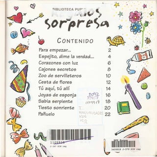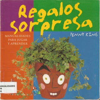 Este documento ofrece 10 ideas para hacer regalos caseros para amigos y familiares. Incluye consejos de seguridad y proyectos como hacer un espejo decorado, corazones de arcilla, organizadores de escritorio de cajas de cerillas, flores de papel, caras de plastilina para la mesa, collares de esponja, serpientes de lectura, macetas sonrientes y pañuelos estampados. Cada idea incluye materiales necesarios y pasos.