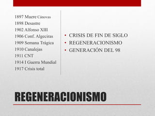 El documento describe el regeneracionismo en España a finales del siglo XIX y principios del XX. El regeneracionismo surgió tras la crisis de 1898 como una corriente que buscaba reformar y modernizar el país mediante medidas políticas, económicas e ideológicas. Políticos conservadores y líderes intelectuales propusieron varias reformas para regenerar a España, incluyendo fortalecer la industria, descentralizar el poder, y algunos incluso propusieron un gobierno autoritario temporal para impulsar las reformas. No obstante, la