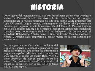 El reggaetón se originó a partir de la adaptación del reggae jamaiquino en América Latina a finales de los años 1970. En los años 1980, artistas panameños como El General popularizaron el reggae cantado en español, mientras que Vico C introdujo el rap en español en Puerto Rico. A principios de los 1990, la fusión del reggae con el rap en español dio origen al reggaetón, el cual se hizo popular underground antes de su comercialización y auge internacional en la década de 2000.