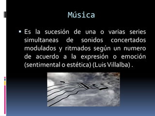 Este documento analiza si el reggaetón debe considerarse música. Se aplicaron 90 encuestas a estudiantes de secundaria, preparatoria y universidad para conocer sus opiniones sobre el reggaetón y sus géneros musicales preferidos. La mayoría opinó que el reggaetón no es música debido a sus letras y contenidos bajos. Sin embargo, la conclusión fue que sí es un género musical aunque carece de características para ser considerado entre los géneros más prestigiosos.