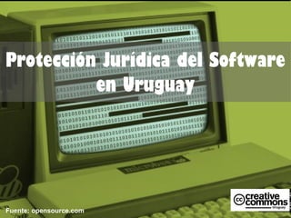 El documento resume la protección jurídica del software en Uruguay. El software puede protegerse bajo derechos de autor, que otorgan protección tanto a elementos literales como código fuente y código objeto, como a elementos no literales como la estructura general del software. La protección se otorga a la expresión del software pero no a las ideas en sí. El software también puede protegerse mediante secretos comerciales u otras leyes en ciertos casos específicos. La principal normativa aplicable en Uruguay incluye la Constitución y leyes sobre derechos de autor y patent