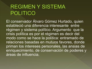 Álvaro Gómez Hurtado estableció una diferencia entre régimen y sistema político. Argumentó que la crisis política se debe al régimen, o la forma en que se hace la política, la cual se basa en favores mutuos y la priorización de intereses personales sobre el bien común. El régimen político se refiere a las normas y leyes que rigen las relaciones políticas de una sociedad, mientras que el sistema político se refiere a modelos de clasificación que diferencian órdenes políticos típicos como los sistemas unipartidistas