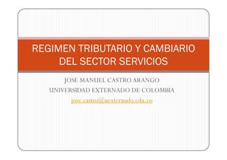 Este documento resume los aspectos tributarios del sector de servicios en Colombia. Explica los conceptos de tributo e impuesto y la clasificación de los tributos. Luego caracteriza el impuesto sobre la renta, incluyendo el hecho generador, sujetos pasivos, territorialidad, residencia, eliminación de doble tributación y beneficios fiscales. Finalmente resume los deberes formales como la declaración de renta.
