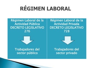 Este documento resume los tres principales regímenes laborales en el Perú según el tipo de empleador: el Régimen Laboral de Decreto Legislativo 276 para trabajadores del sector público, el Régimen Laboral de Decreto Legislativo 728 para trabajadores del sector privado, y el Régimen Laboral de Decreto Legislativo 1057 para trabajadores bajo el régimen de Contrato Administrativo de Servicios. Explica las diferencias en derechos laborales como protección contra despido, aguinaldo, gratificaciones y licencia