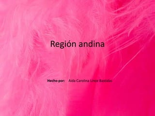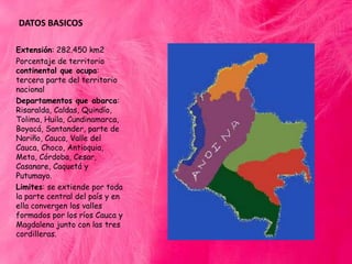 La región andina de Colombia abarca 19 departamentos y una extensión de 282.450 km2, que representa la tercera parte del territorio nacional. Se caracteriza por una rica gastronomía que incluye tamales, lechona, mazamorra y arepa, y por importantes festivales como el Festival Internacional de la Cultura y el Reinado Internacional del Café. La música tradicional de la región se toca con instrumentos como el tiple y las bandolas, y se baila bambuco, san juanero y guabina con trajes típicos que