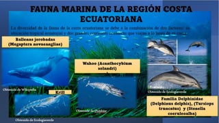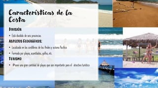 Este documento describe la ecología de la costa ecuatoriana. Se divide en seis provincias y posee una gran diversidad de ecosistemas como bosques de manglares, bosques secos y húmedos. Tiene una población de más de 8 millones de habitantes y un clima tropical cálido. Cuenta con varios ríos importantes y una flora que incluye cocoteros, manglares y plantas endémicas. Su fauna incluye iguanas, monos, armadillos y diversas aves. La región es biodiversa y econ