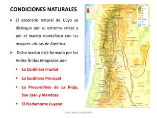 El documento describe las condiciones naturales y la estructura productiva de la región de Cuyo en Argentina. La región se distingue por su extrema aridez y por las altas montañas de la Cordillera de los Andes. Los ríos son escasos pero vitales para los oasis agrícolas donde vive la mayoría de la población. La agricultura, especialmente de vid y frutales, y el turismo son las principales actividades económicas. El clima árido presenta desafíos pero los residentes han logrado aprovechar los recurs
