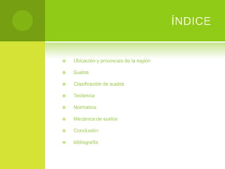 Este documento describe los tipos de suelo en la región del Biobío en Chile. Explica que hay diferentes clasificaciones de suelos como Alfisoles, Ultisoles, Inceptisoles y Entisoles. También cubre factores como la tectónica, normativa y mecánica de suelos que son relevantes para el diseño de cimientos. El documento analiza específicamente los suelos en un proyecto de viviendas y recomienda el uso de zapatas continuas con sobre cimiento armado debido a las características del subsuelo en