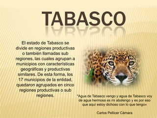 Este documento presenta información sobre la región del Centro de Tabasco, México. Proporciona detalles sobre los municipios de Nacajuca y Jalpa de Méndez, incluyendo lenguas locales, costumbres, vestimenta típica y gastronomía. También resume las características generales del estado de Tabasco y su división en cinco regiones productivas.