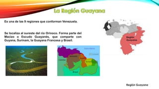 El documento proporciona información sobre la Región Guayana de Venezuela. En 3 oraciones resume que la Región Guayana se localiza al sureste del río Orinoco y comprende los estados de Bolívar, Amazonas y Delta Amacuro. Es una de las regiones más antiguas del mundo y cuenta con una diversa flora y fauna.