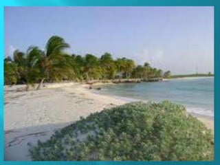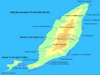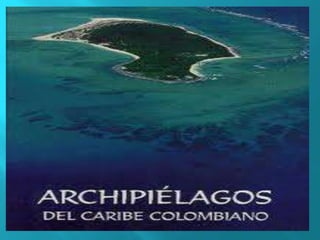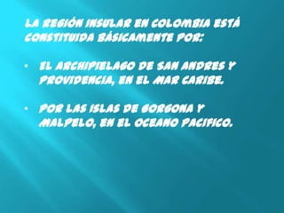 El documento presenta una descripción general de las principales islas e islotes que conforman la Región Insular de Colombia en el Mar Caribe y el Océano Pacífico. Estas incluyen el Archipiélago de San Andrés y Providencia, los cayos de Albuquerque, Serrana, Roncador y Quitasueño, y las islas de Malpelo, Gorgona y Gorgonilla. Se describen aspectos como la ubicación, relieve, hidrografía, clima y economía de cada una de estas islas.