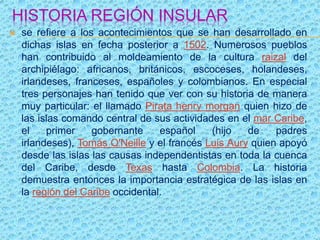 El documento describe la historia y cultura de la región insular de Colombia, destacando su diversidad étnica y la influencia de personajes históricos como Henry Morgan y Luis Aury. También se abordan las características geográficas de las islas, así como los instrumentos musicales típicos y estilos presentes en la música de la región, resultado de la fusión de tradiciones africanas y caribeñas. Se menciona la presencia de artistas y grupos musicales que contribuyen a la preservación y evolución de estas expresiones culturales.