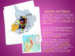 Santander, localizado en la zona nororiental de Colombia, es el sexto departamento más poblado y la cuarta economía del país, con Bucaramanga como su capital. La región es rica en tradiciones gastronómicas y culturales, incluyendo festivales y danzas típicas como el bambuco y la guabina. Santaferes tiene una notable influencia indígena y cuenta con atractivos turísticos como el Parque Nacional Chicamocha y la Catedral de Bucaramanga.