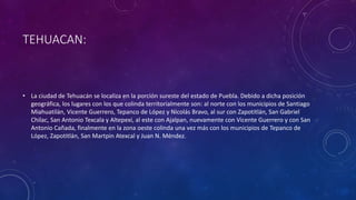 La región de Tehuacán en Puebla es conocida por sus manantiales de agua mineral y por producir granadas. Tehuacán tiene una industria minera desarrollada y atracciones turísticas como manantiales, iglesias y conventos. Las principales costumbres y tradiciones de la región incluyen celebrar el Día de Muertos y la Semana Santa, así como fiestas patronales en varios pueblos con danzas tradicionales, procesiones y fuegos artificiales.