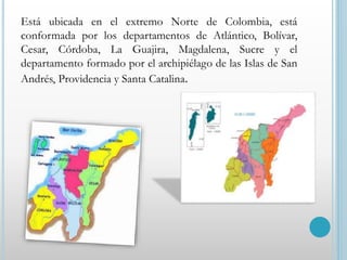 La región Caribe de Colombia está conformada por 8 departamentos y se ubica en la parte norte del país. Su territorio es mayoritariamente plano y posee un clima cálido. Sus principales actividades económicas son la agricultura, la ganadería, la minería y el turismo. La población está compuesta por diversos grupos étnicos como indígenas, afrodescendientes y europeos.
