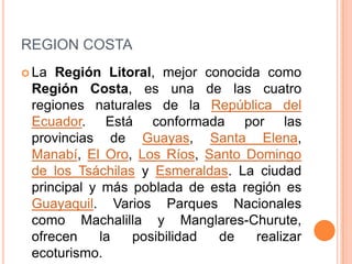 La Región Costa de Ecuador incluye 7 provincias y está dominada por la ciudad de Guayaquil. Ofrece paisajes naturales protegidos como parques nacionales y rutas turísticas que muestran la cultura, historia, flora, fauna y gastronomía de la región. Algunas rutas notables son la Ruta del Spondylus, que pasa por varios pueblos costeros, y el turismo en las provincias de Esmeraldas, Manabí y Guayas, que incluye playas, reservas naturales, música local