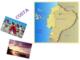 La Región Costa de Ecuador está conformada por 7 provincias y cuenta con ciudades importantes como Guayaquil y Puerto López. Ofrece paisajes naturales como playas, parques nacionales y áreas protegidas ideales para el ecoturismo. Algunas de sus provincias más destacadas son Guayas, Manabí y Esmeraldas.