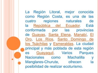La Región Litoral de Ecuador, también conocida como Región Costa, está formada por llanuras fértiles, colinas y cuencas sedimentarias a lo largo de la costa del Océano Pacífico. Incluye siete provincias que ofrecen playas y balnearios populares, así como parques nacionales que permiten ecoturismo. La principal ciudad y puerto es Guayaquil.