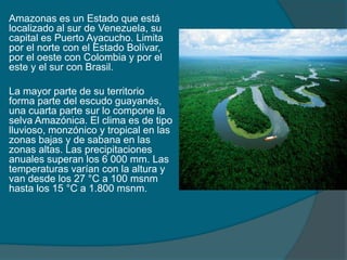 Amazonas es un estado al sur de Venezuela con capital Puerto Ayacucho. Limita con los estados de Bolívar y Colombia, así como con Brasil. La mayor parte de su territorio forma parte del escudo guayanés, mientras que el cuarto sur lo compone la selva amazónica. Alberga a 62 grupos étnicos indígenas y cuenta con variadas manifestaciones folclóricas como danzas y música tradicional con instrumentos de viento y percusión. El estado también protege varios parques y monumentos naturales de gran belleza paisajística.