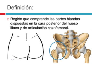 La región glútea comprende las partes blandas de la cara posterior del hueso ilíaco y de la articulación coxofemoral. Está delimitada por la cresta ilíaca, la columna sacroccígea y el trocánter mayor. Contiene los músculos glúteo mayor, mediano y menor, inervados por los nervios glúteos superior e inferior. Las arterias glúteas superior e inferior irrigan la región.