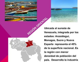 La región nororiental de Venezuela comprende los estados de Anzoátegui, Monagas, Sucre y Nueva Esparta, que representan el 45% de la superficie nacional. Incluye ciudades importantes como Barcelona, Puerto La Cruz, Maturín y Cumaná, así como áreas naturales protegidas como el Parque Nacional Mochima. La economía se basa en la industria petrolera, la agricultura, la pesca y el turismo.
