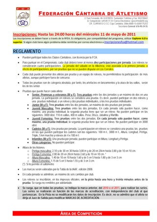 Este documento presenta el reglamento y el programa del Campeonato de Cantabria Absoluto por Clubes de Atletismo que se celebrará los días 13 y 14 de mayo en Los Corrales de Buelna y Santander. Incluye las pruebas a disputar cada día, los requisitos de participación de los atletas según categoría, y las normas sobre inscripciones, homologación de artefactos, y puntuación de los clubes.