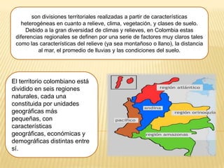 El documento describe las seis regiones naturales de Colombia. Cada región se define por factores como el relieve, clima y vegetación. La región Amazónica comprende el 42% del territorio nacional y es la zona menos poblada del país. La región Andina es la más poblada y económicamente activa.