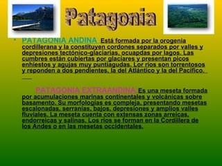 La Argentina se divide en ocho regiones geográficas formales definidas por su relieve, clima y recursos: 1) Patagonia andina, 2) Patagonia extraandina, 3) Cuyo, 4) Sierras pampeanas, 5) Llanura platense, 6) Chaco, 7) Esteros correntinos y 8) Llanura pampeana. Cada región tiene características propias en términos de geografía física.