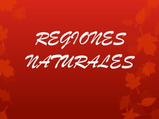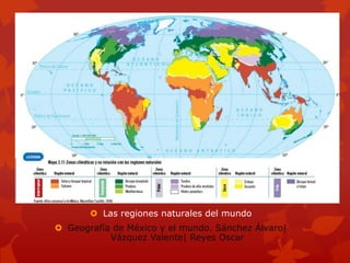 Este documento describe las diferentes regiones naturales del mundo determinadas por el clima, la vegetación y la fauna. Las principales regiones son los bosques de coníferas y encinos, bosque de montaña, pastizal, matorral, sabana, selva seca, selva húmeda y región marina. El clima influye en la vegetación y fauna de cada región, dividiéndolas en selva y bosque tropical, sabana, estepa, desierto, pradera, taiga y tundra.