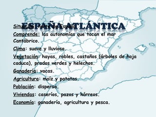 El documento describe las principales características geográficas, climáticas, de vegetación, ganadería, agricultura, población, vivienda y economía de las cinco grandes regiones de España: el norte, el este, el sur, el interior y las Islas Canarias.