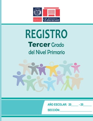 Este documento presenta el Registro de Grado del Nivel Primario de la República Dominicana. Incluye instrucciones para completar los datos generales del centro educativo, maestro, estudiantes y resumen de matrícula. También contiene secciones para registrar la asistencia, evaluaciones de aprendizaje, condición final de los estudiantes e informes individuales. El propósito es monitorear el progreso de los estudiantes y sustentar el desarrollo curricular requerido para cada grado.